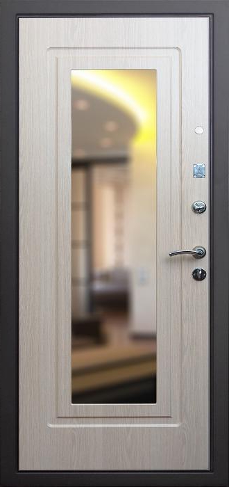 Эта модель создана для тех, кто ценит не только прочность, но и практичность в повседневном использовании. Стальной каркас из профильной трубы и лист металла толщиной 2 мм с рёбрами жёсткости формируют надёжную основу, способную выдерживать серьёзные нагрузки. Снаружи дверь защищена порошковым покрытием, которое устойчиво к влаге, солнцу и механическим повреждениям, а изнутри отделана МДФ-накладкой, придающей интерьеру уют и аккуратность. В центре конструкции внимание привлекает зеркало — удобная деталь, которая избавляет от необходимости в дополнительном настенном аксессуаре и одновременно делает пространство визуально просторнее. Именно здесь название модели — металлическая дверь с зеркалом в дом №2 — обретает своё значение, сочетая функциональность с эстетикой. Для повышения безопасности предусмотрены два замка российского производства с независимыми системами запирания, а также блокираторы. Два контура уплотнителя защищают от сквозняков и пыли, а возможность выбрать направление открывания делает установку универсальной. Металлическая дверь с зеркалом в дом №2 от производителя: быстрое изготовление и монтаж в Александрове, индивидуальные размеры, широкий выбор материалов и фурнитуры, официальная гарантия до 10 лет.