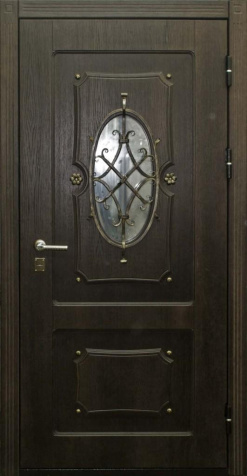Входная металлическая дверь с порошковым покрытием стеклом и ковкой в частный дом №27